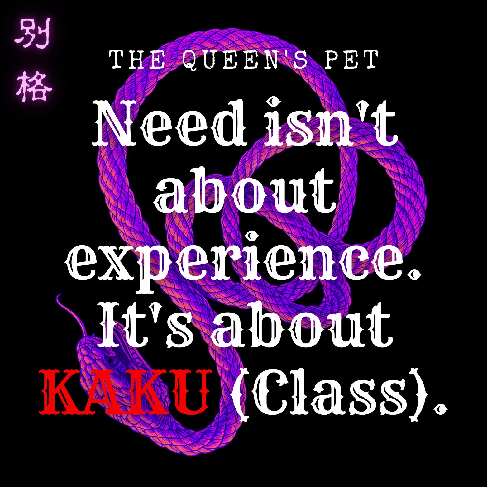 デザインの下部に鎮座するのは、鮮烈なクリムゾンレッドで描かれた「KAKU(格)」の文字。 そこに絡みつくのは、ただの縄ではありません。それは、女王・奎(けい)の絶対的な意志が具現化した、蛇のごとき「縛りと鞭」。